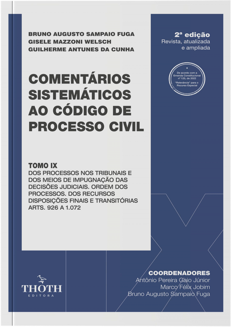 O sistema processual civil brasileiro vem, hodiernamente, passando por transformações profundas, as quais, para além da natureza fenomenológica de seu objeto – o processo –, atingem, por diversas formas e contextos, a viabilidade garantidora de proteção e conquista de direitos, sobretudo daqueles tidos como fundamentais.A pretexto de analisar, refletir e comentar, de forma sistemática, as normas que regem o Código de Processo Civil, sem descurar do assentamento de posicionamentos jurisprudenciais, súmulas e precedentes qualificados a cada artigo, apresenta-se a presente Coleção “Comentários Sistemáticos ao Código de Processo Civil”, editada pela Editora Thoth e composta por 9 (nove) tomos, com a proposta de contribuir para a reflexão crítica do processo civil dos nossos tempos. Ela permite ao leitor — seja ele estudante, profissional do Direito, acadêmico, professor, dentre outros — estudar por fonte segura e reflexiva, a partir de um rol de processualistas da mais alta qualidade e competência, convocados por sua área do saber a tecer comentários de índole dogmática e pragmática sobre os 1.072 artigos que compõem o CPC/2015.